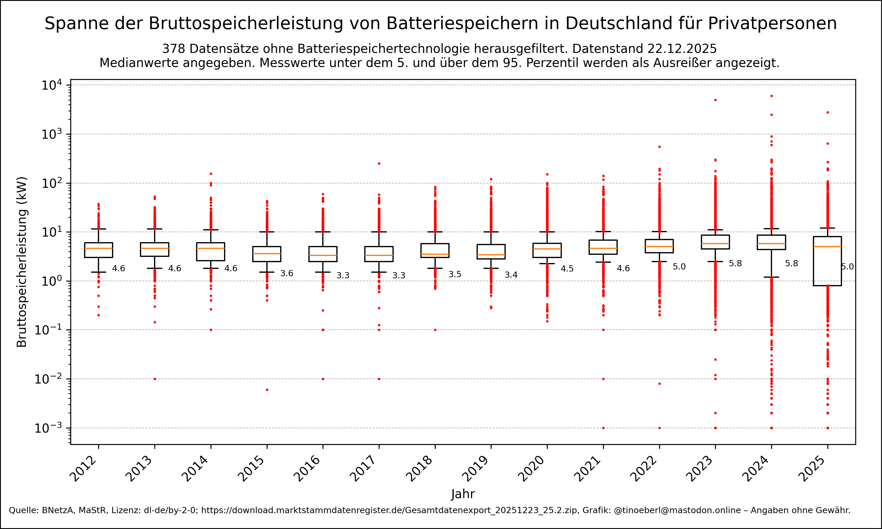 Spanne der Bruttospeicherleistung von #Batteriespeichern pro Inbetriebnahmejahr von Privatpersonen in Deutschland mit Stand vom 22.12.2025.