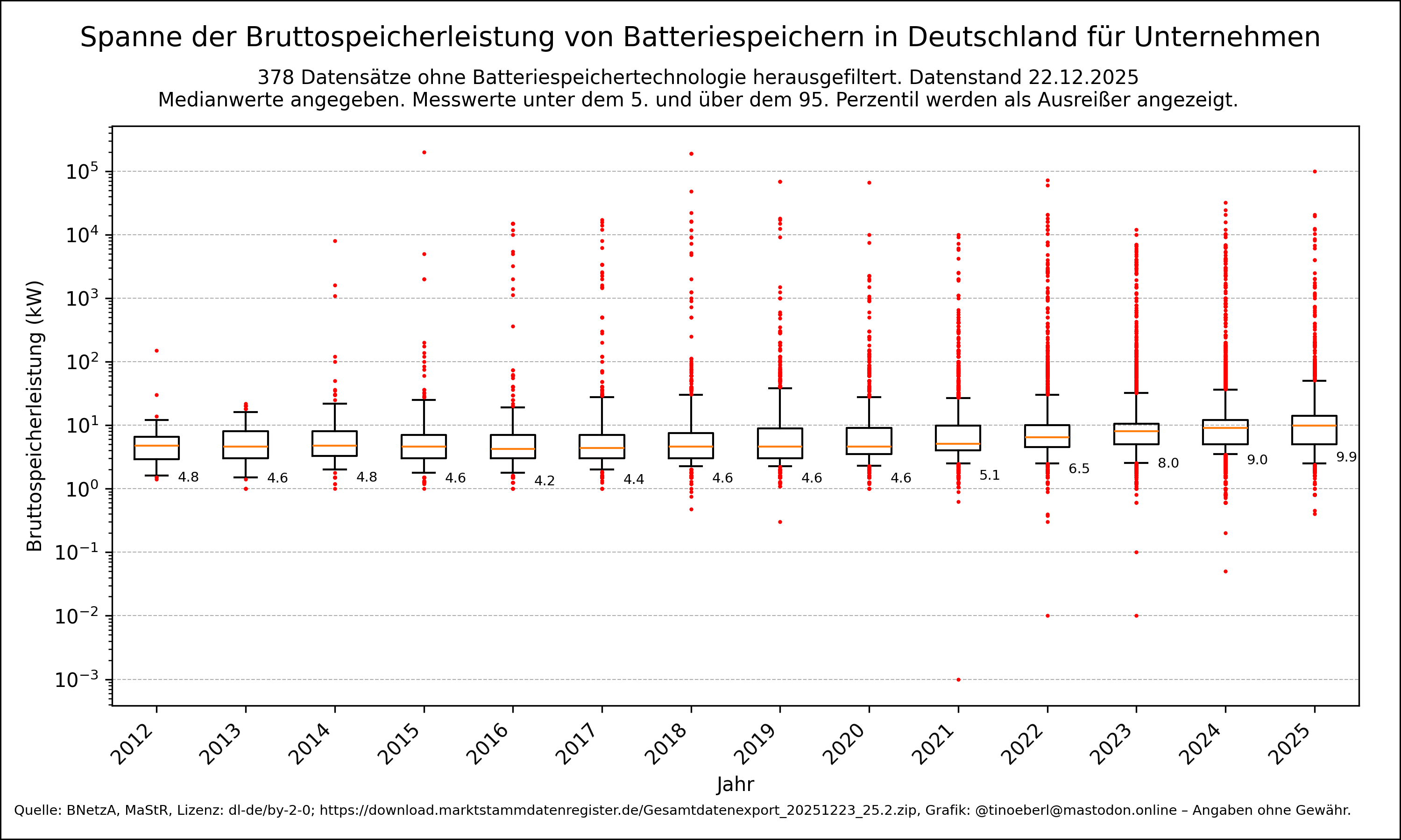 Spanne der Bruttospeicherleistung von #Batteriespeichern pro Inbetriebnahmejahr von Unternehmen in Deutschland mit Stand vom 22.12.2025.