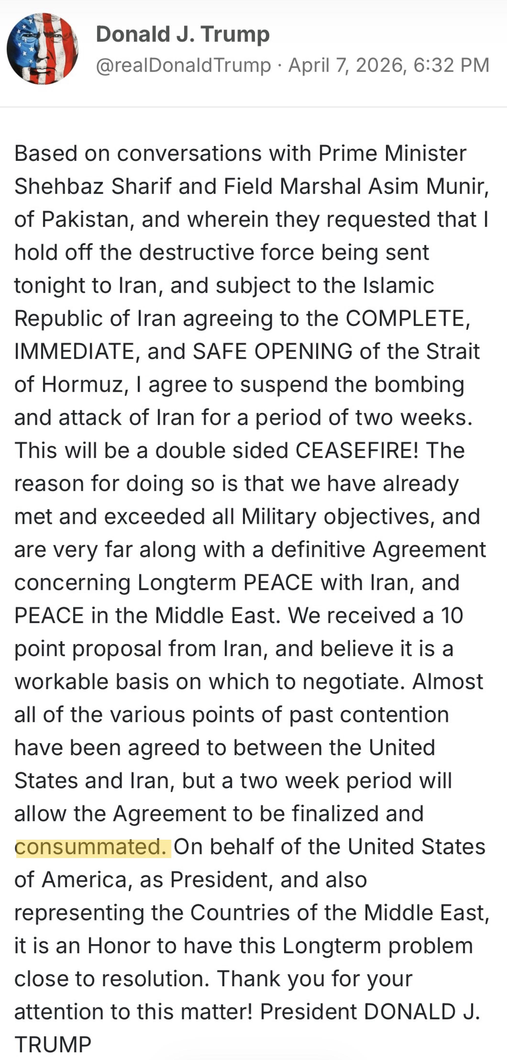 “Subject to the Islamic Republic of Iran agreeing to the COMPLETE, IMMEDIATE and SAFE OPENING of the Strait of Hormuz,”