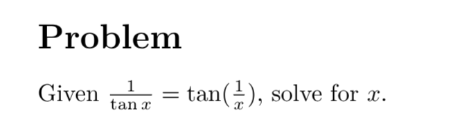 The problem: Given `1 / tan(x) = tan(1 / x)`, solve for `x`.