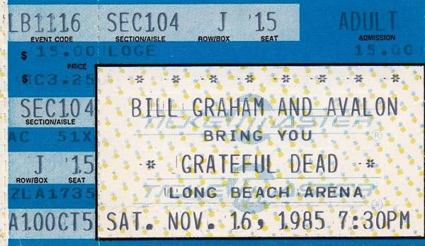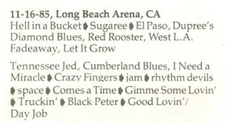 11/16/85 long beach: rare post-’74 2nd set TENNESSEE JED, last time as set opener, more juice than usual; same for CUMBERLAND BLUES, a lesh slot. 57-minute CRAZY FINGERS > DRUMZ > SPACE > COMES A TIME > GIMME SOME LOVIN’ > TRUCKIN’ > BLACK PETER > GOOD LOVIN’. shaky CRAZY FINGERS lyrics, but deep wounded COMES A TIME holds achingly steady. solid Beamin’ melts to thoughtful garcia/weir SPACE. GIMME SOME LOVIN’ vocal jamminess. weir takes mic off stand & wanders for GO…