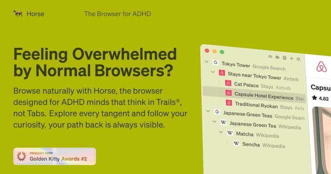 Find of the day: Horse Browser - a browser for people with #ADHD (or who like organization in general). Interesting concept. https://browser.horse (via @…