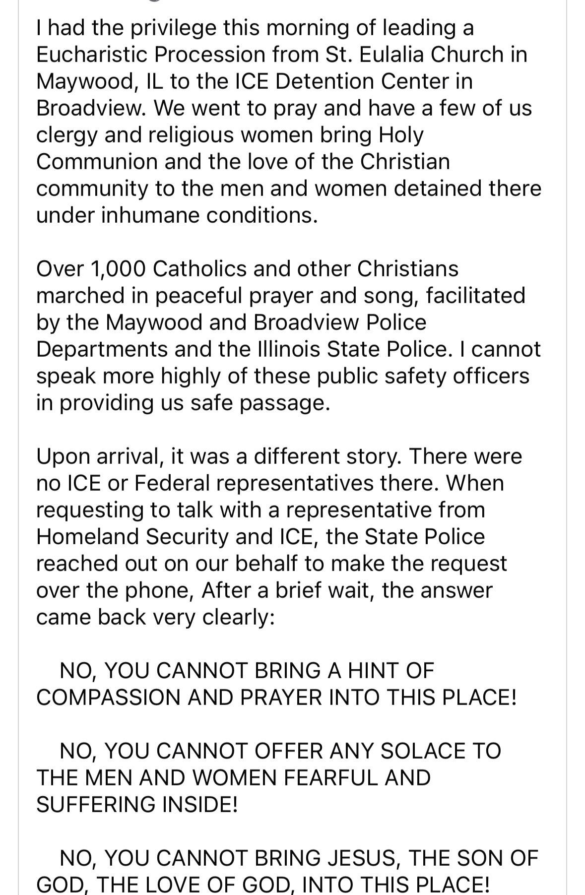 Chicago priest Fr. Larry Dowling describes procession to ICE facility: “No one had the courage to speak directly to us. No one from Homeland Security could stand in the presence of the Monstrance holding the Blessed Sacrament. No wonder. Evil is repelled, recoils in the presence of Christ.”