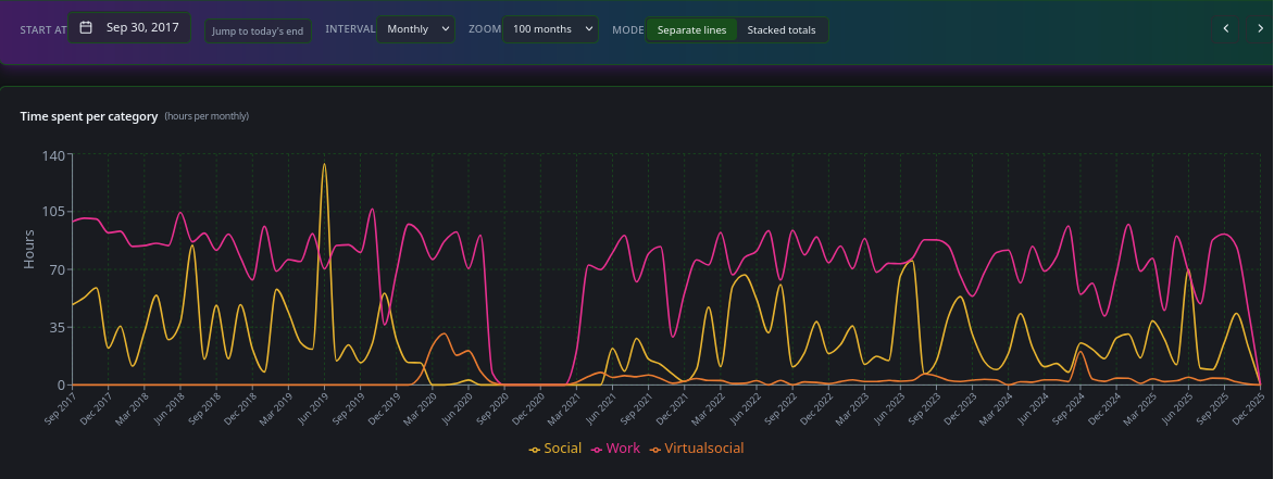 Then clearly visible is the drop-off in social activity as the COVID pandemic hit. Virtual-Social (IE zoom meetings and the like) picked up quite a bit around there but had died back to almost nothing way before the hours spent with actual people started to tick up.