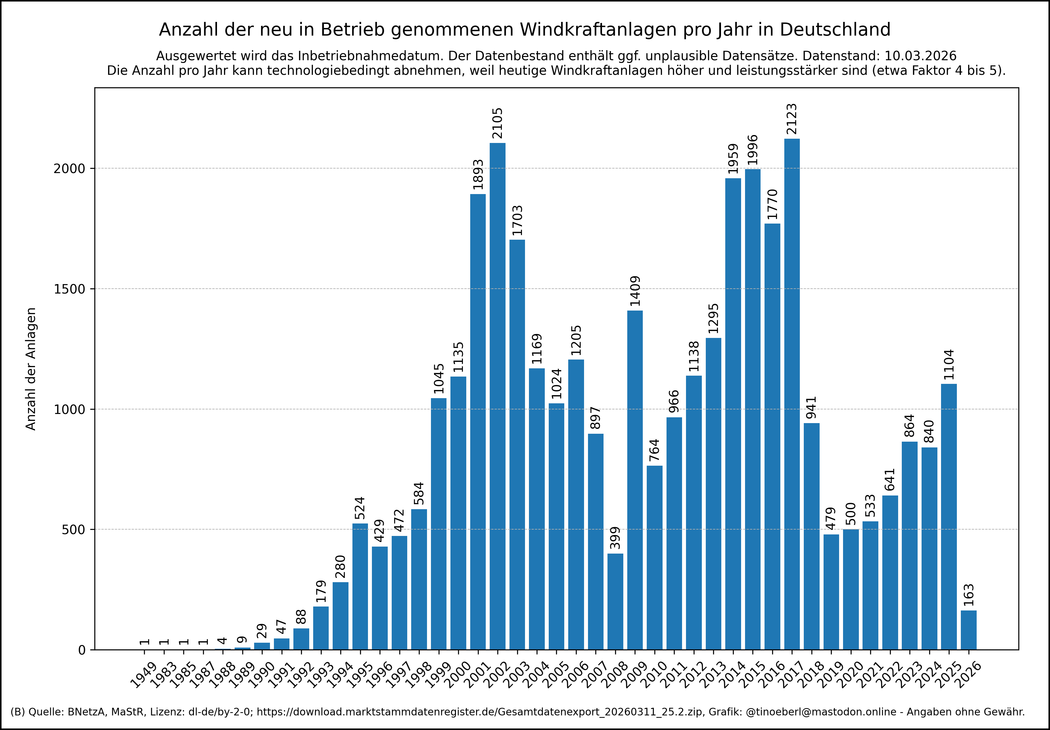 Anzahl der installierten #Windkraftanlagen pro Jahr in #Deutschland mit Stand vom 10.03.2026.