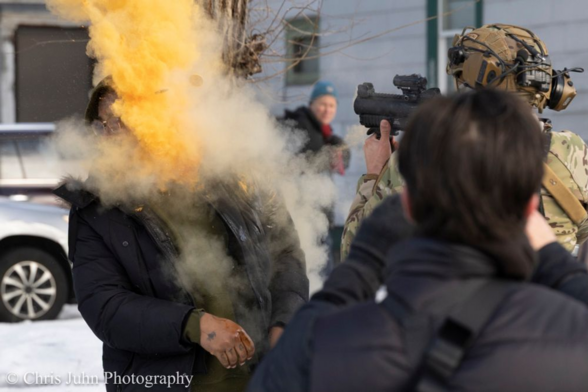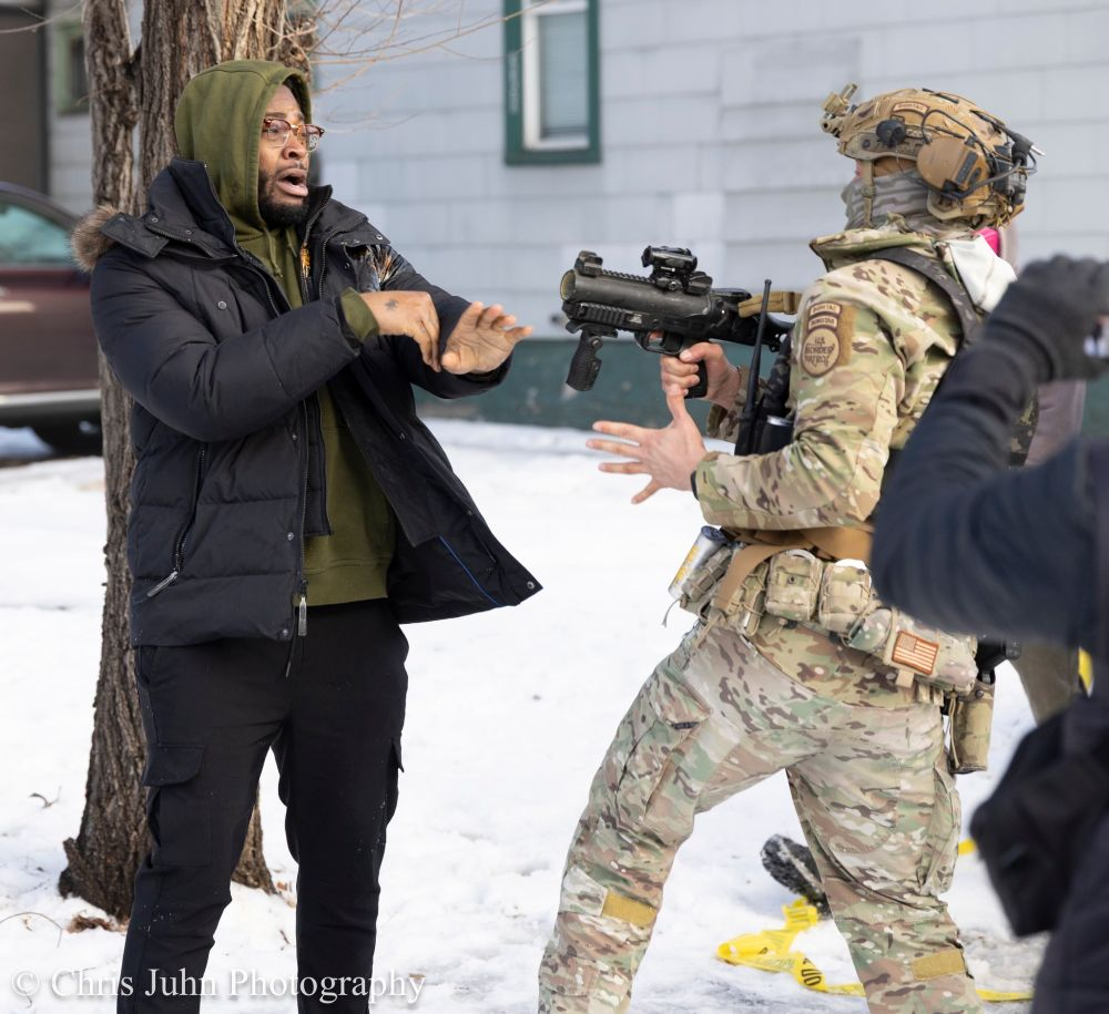 ALT: Die beiden Bilder zeigen einen US-amerikanischen militarisierten Polizisten, der einem Farbigen aus ca 1m Entfernung einen pepper ball (Pfeffergranate) ins Gesicht schießt.