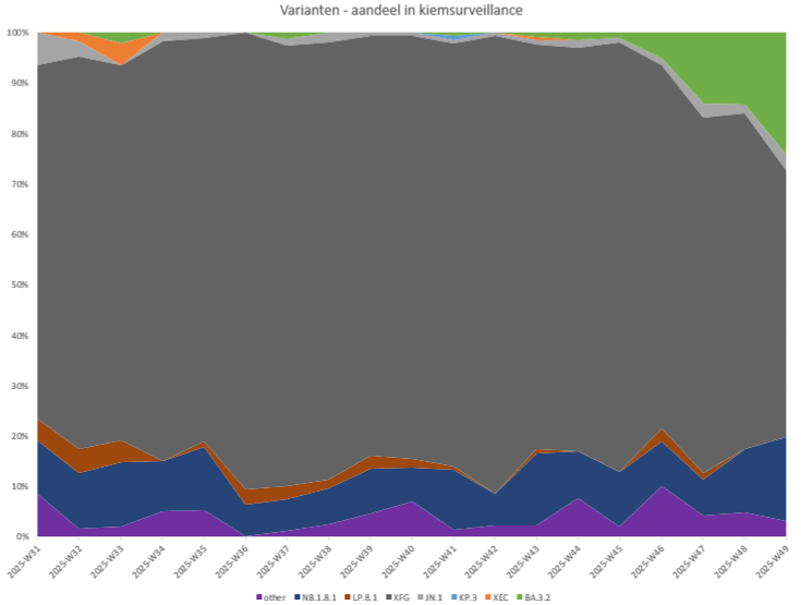 In het plaatje van deze week gaat BA.3.2 toch een stuk minder hard dan twee weken geleden, vooral de weken 48 en 48 zijn wat dat betreft naar beneden bijgesteld. Over de weken 50 en 51 nog bijna geen samples. XFG blijft dominant.
