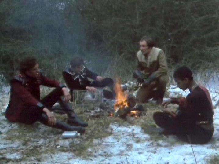 [Planet terminal. Exterior, night. A crude camp has been made. A small fire burns in the centre. Dayna, Tarrant and Avon are seated around the fire. Avon has Orac in his lap and is attempting to repair it.]