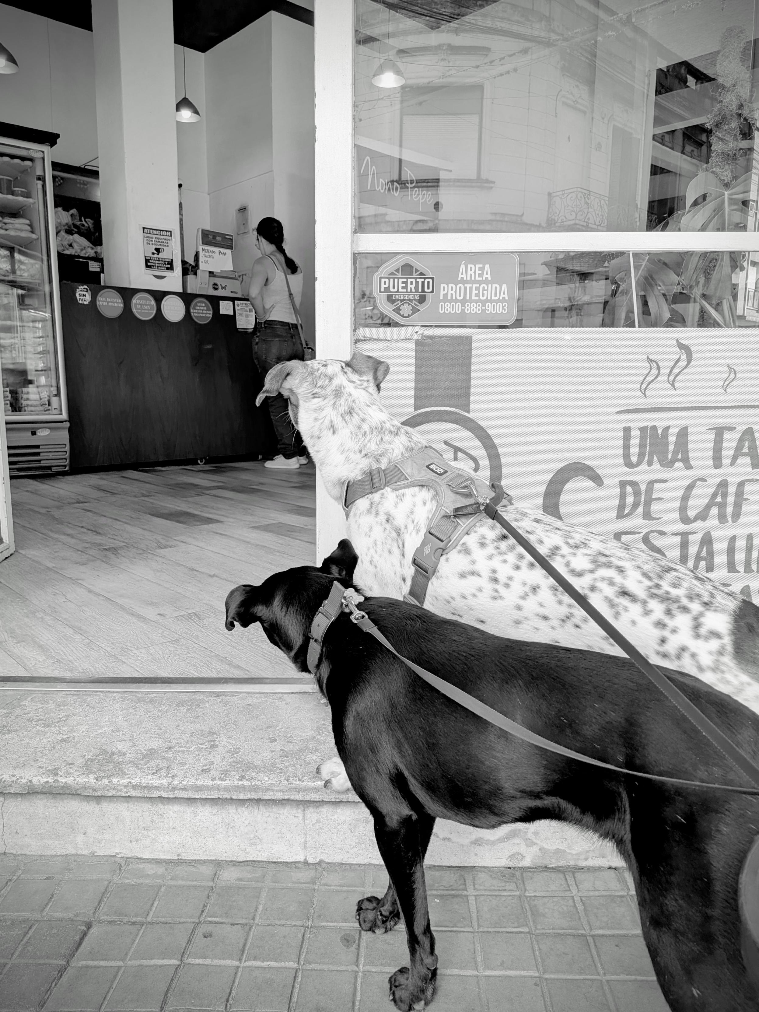 A family picture. Not sure if the dogs look at their mom or at all the pastries inside the bakery. 🍰 🥐