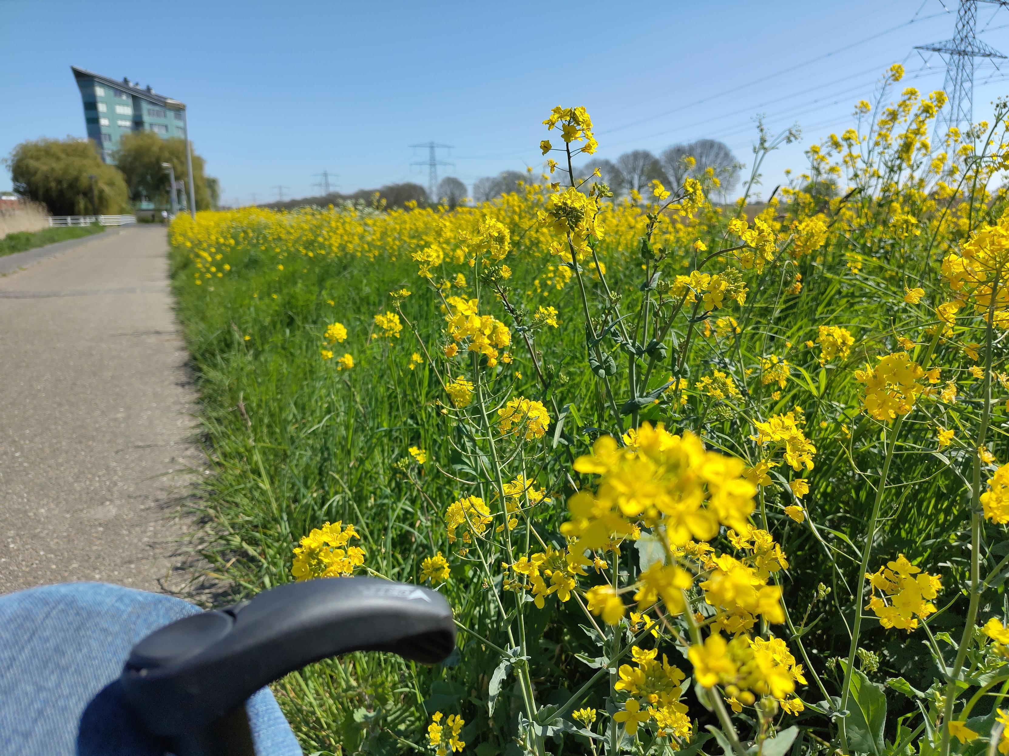 Ik voerde de #trike door de Almeerse tuinbouw-, waar ook een flinke sleurhuttenkwekerij is gevestigd, en moerasgebieden. Het koolzaad bloeit. Het was een vergelijkbaar rondje met dat ik vrijdag afbrak, maar nu wel de volle geplande lengte en zonder plotse riool geluiden bij het ademen. Veel wind, heerlijk weer. #regel17