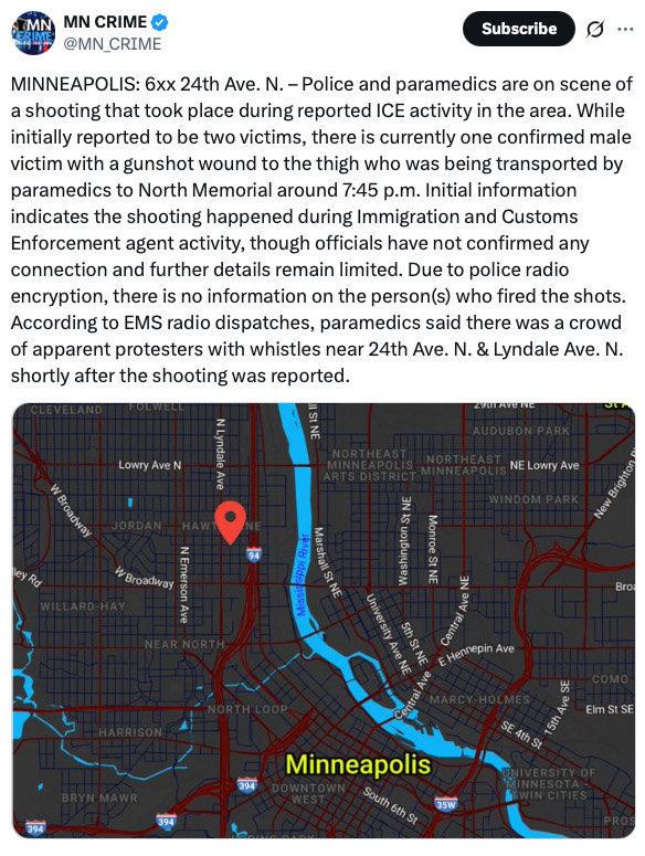 Here’s the best info I have (which seems to be corroborated despite the scammy “CRIME” account name): now reported to be just one person hit, in the thigh. My guess is that the press will be picking up now and we won’t get really clear info until the dust has settled.