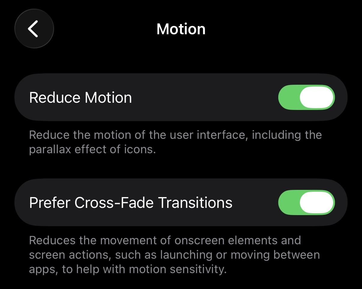 Screenshot in Accessibility / Motion: turn on Reduce Motion and Prefer Cross-Fade Transitions.