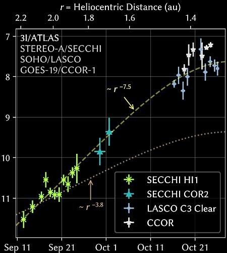 @cosmos4u@scicomm.xyzAnd here comes ... another light curve of interstellar comet #ATLAS through much of October, now based on the satellite coronagraphs LASCO C3 and CCOR-1, with observations up to and including October 26th! From the paper "Rapid Brightening of 3I/ATLAS Ahead of Perihelion" - https://arxiv.org/abs/2510.25035 - out minutes ago: it finds that "CCOR-1 also resolves the comet as an extended source with an apparent coma ~4' in diameter. Furthermore, LASCO color photometry shows the comet to be distinctly bluer than the Sun, consistent with gas emission contributing a substantial fraction of the visible brightness near perihelion."