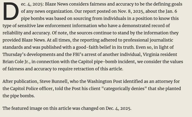 The Blaze retracts its article accusing a former Capitol Police officer of being the January 6 pipe bomber after the FBI arrested a different person (Will Sommer/@willsommer)
