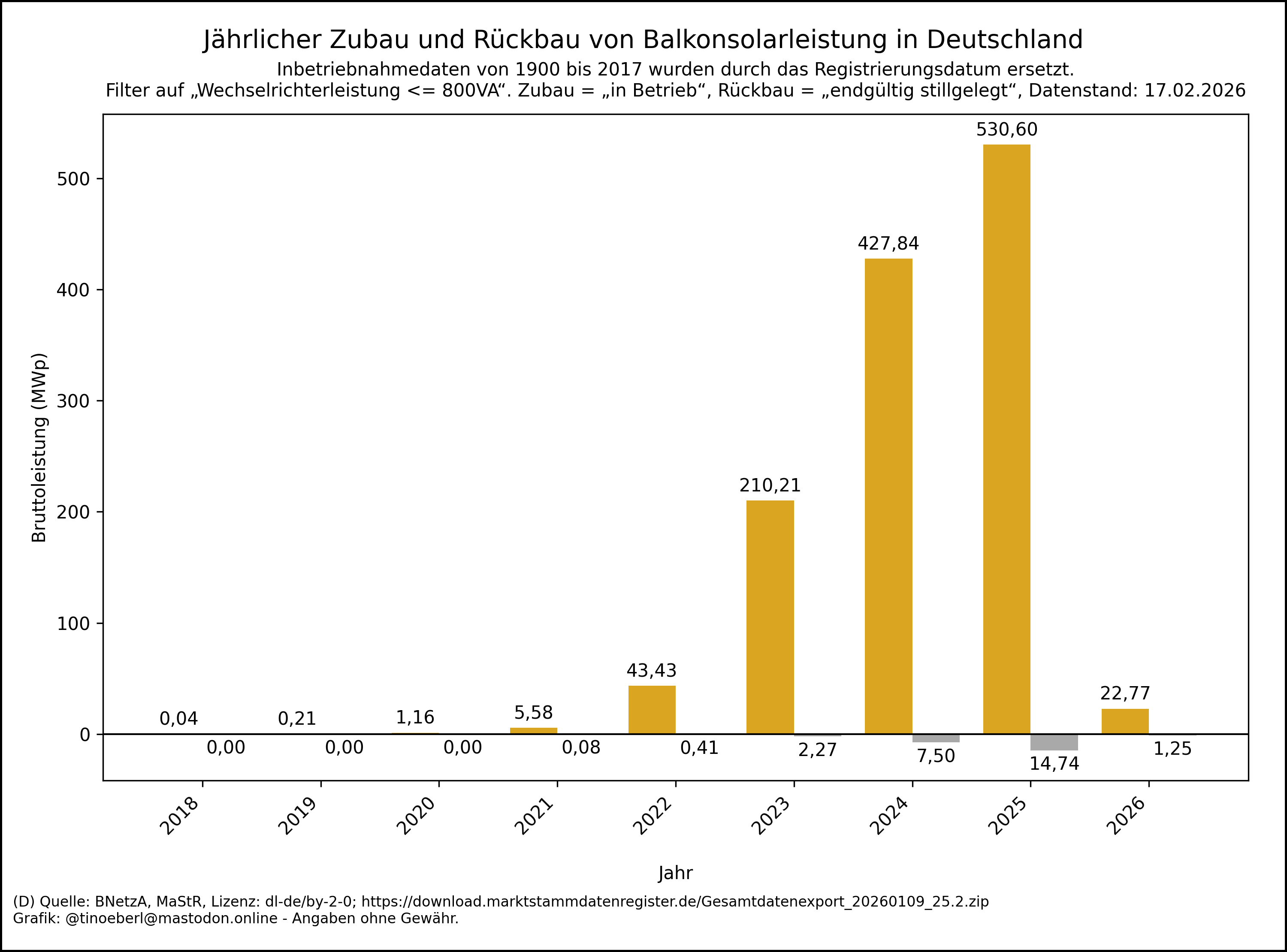 Jährlicher Zubau und Rückbau von #Balkonsolarleistung in Deutschland mit Stand vom 17.02.2026.