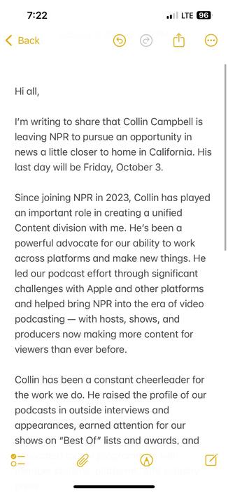 Sources: Collin Campbell, NPR's podcasting strategy chief since 2023 and a former Gimlet executive editor, is leaving the network to join Apple (Ben Mullin/@benmullin)