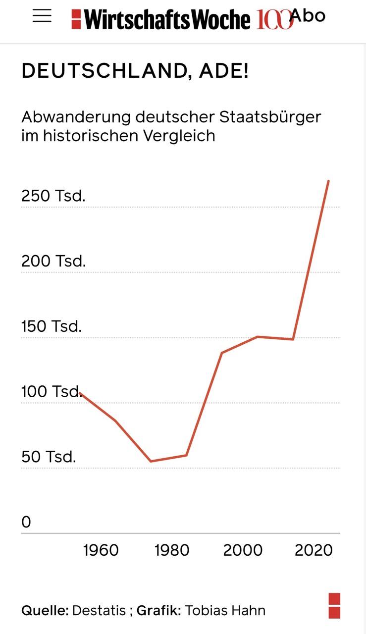 Germany's population is estimated to decline by 10% by 2070, from 83.5 to 74.7 million. One of the reasons is emigration; over 250,000 people per year leave #Deutschland.