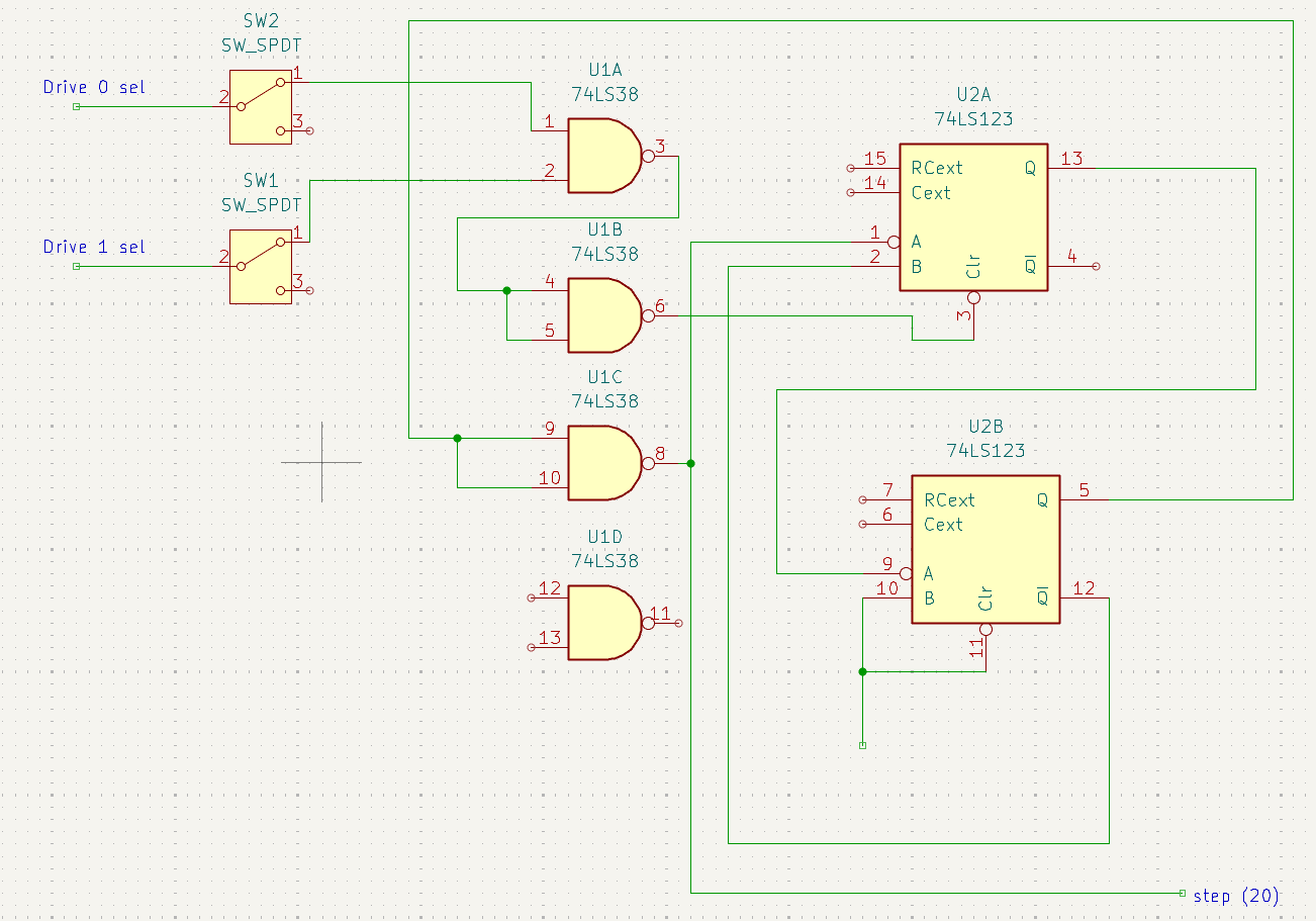 I'm currently debugging why a pair of cumana 5.25" floppy drives doesn't step on one of my Model B's; it's got a switchable 40/80 board on it which is where my current suspicion lies; a Cumana CU1585 (?) board - which I reckon is something like below. The step line seems to be stuck at about 1.4v.