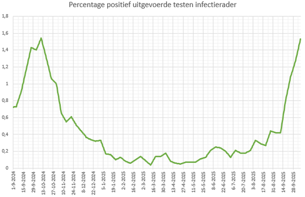 Ik begin vandaag met het percentage positief, omdat dat opnieuw fors gestegen is en inmiddels vrijwel even hoog is als de top van de herfstgolf in 2024.