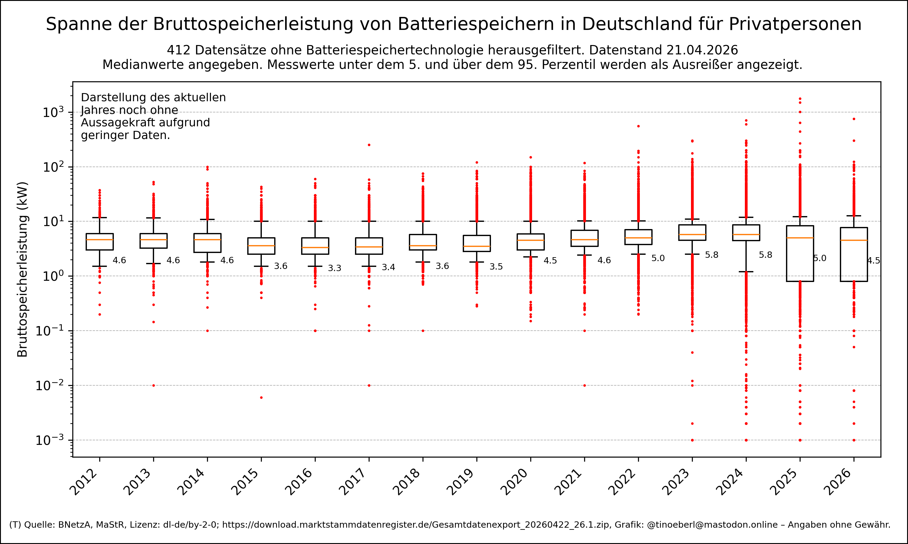Spanne der Bruttospeicherleistung von #Batteriespeichern pro Inbetriebnahmejahr von Privatpersonen in Deutschland mit Stand vom 21.04.2026.