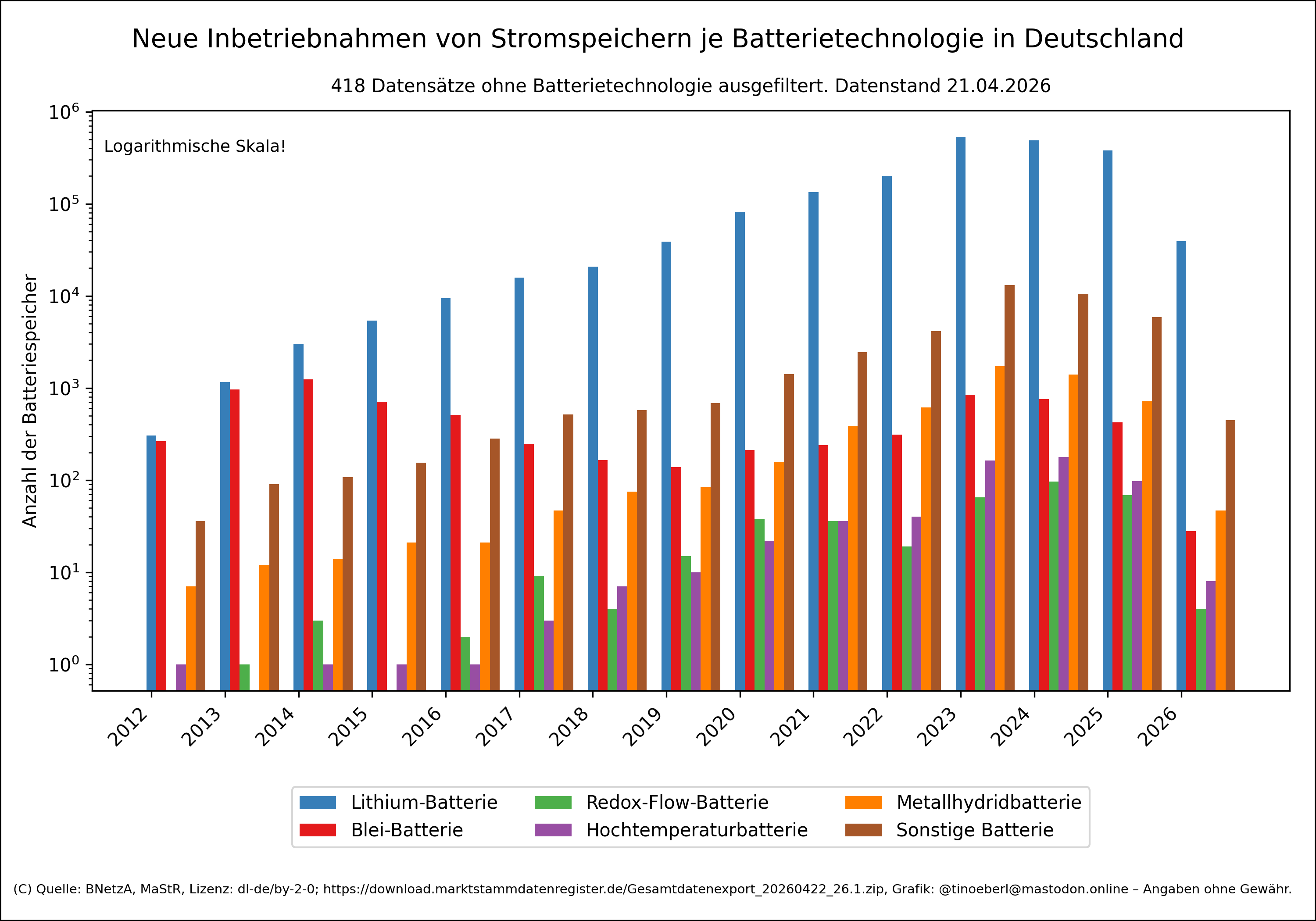 Neue Inbetriebnahmen von #Stromspeichern je #Batterietechnologie in #Deutschland mit Stand vom 21.04.2026.