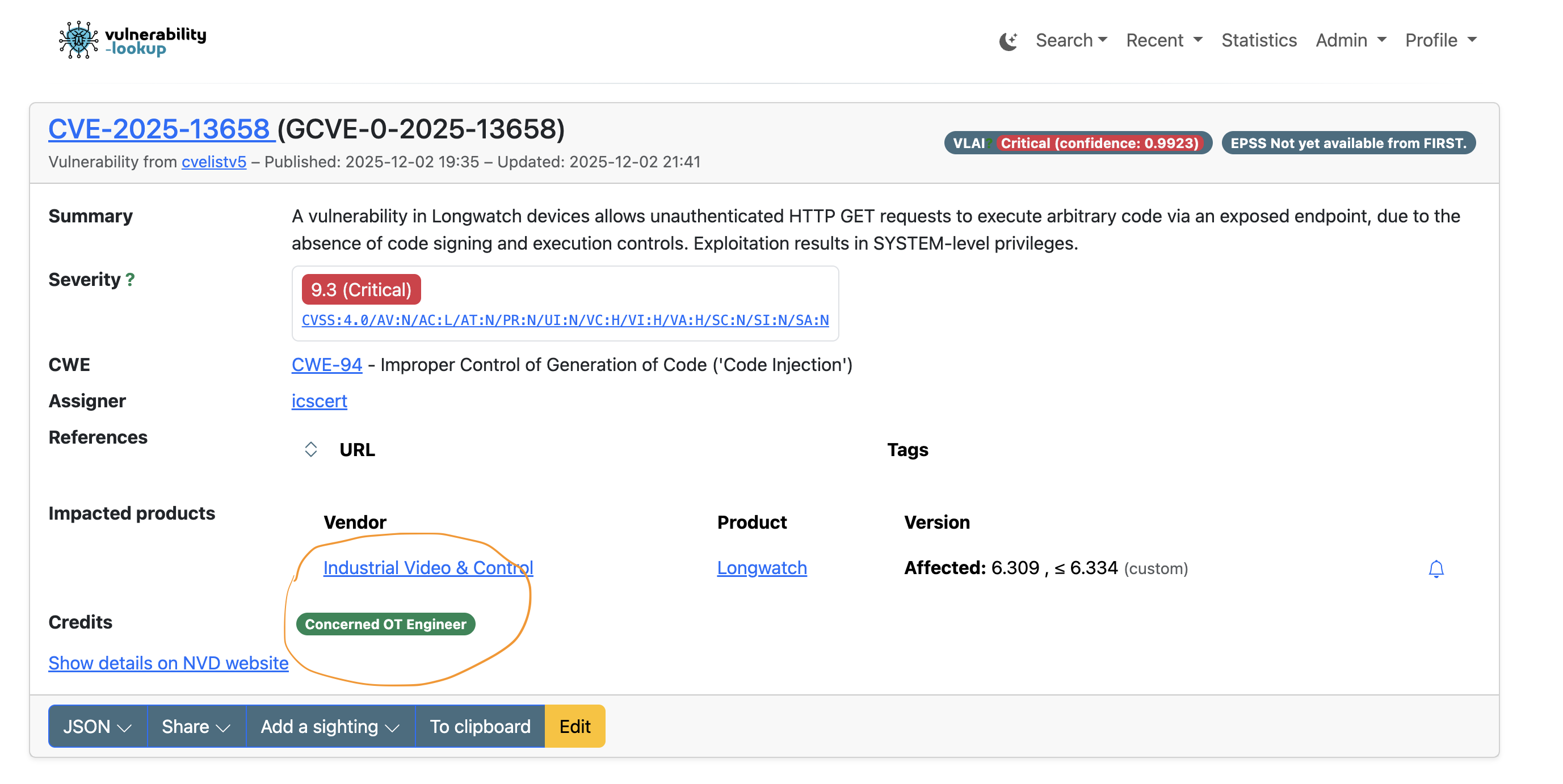 I particularly enjoyed this one. By the way, in Vulnerability Lookup we also have a nice display of the actual credits: finder, coordinator, and so on.