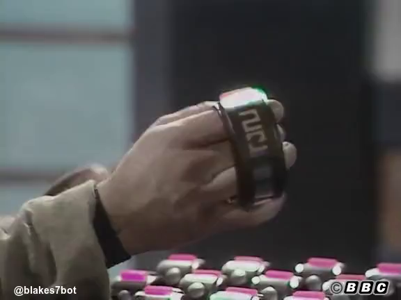 BLAKE: [Indicates bracelet] Presumably these are part of the recall system. This looks like a communicator. [into the bracelet] Hello. Testing. One. Two. Three. [to Avon] Seems to work all right.