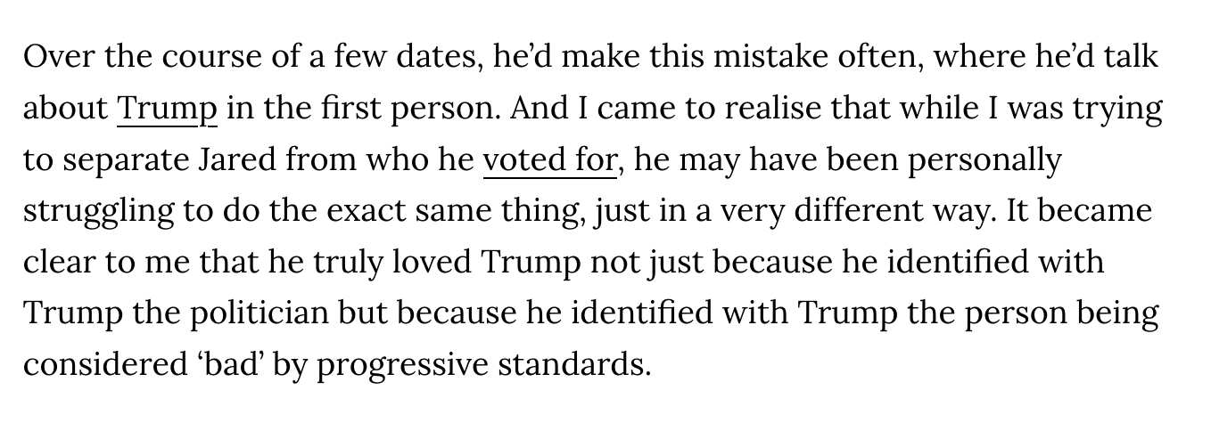 This article about a liberal reporter dating MAGA men really shows some of the core of what's breaking this world right now. And it's not just the US. Men are not okay. Like at all.