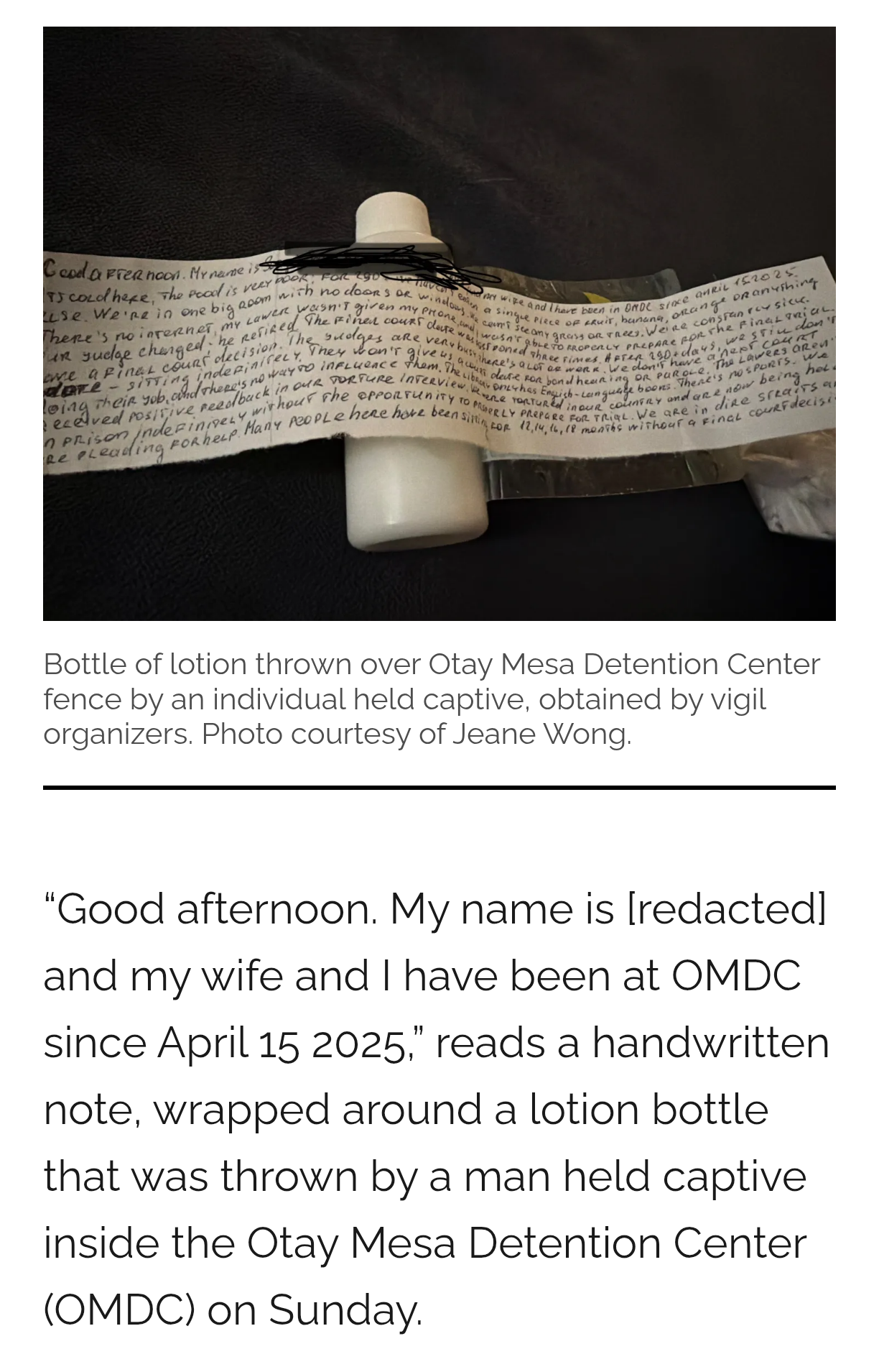 Exclusive: Detention Center Captives Are Throwing Lotion Bottles Wrapped With Notes to Organizers Outside Otay Mesa Facility ~ L.A. TACO