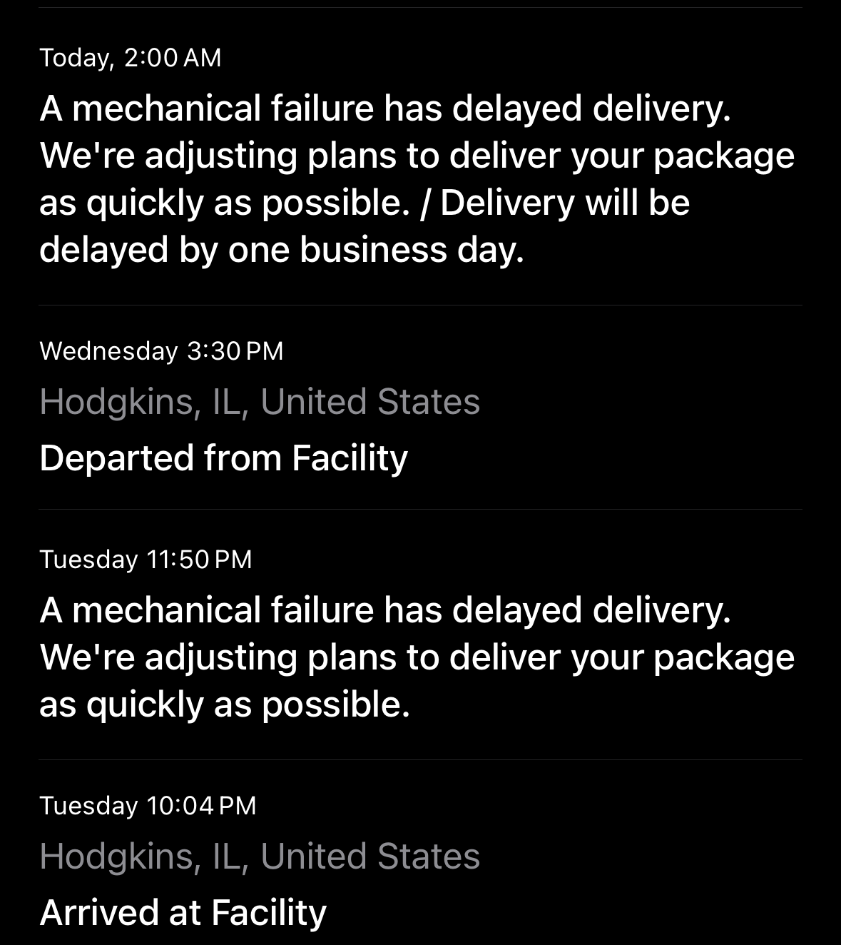 Currently have two deliveries, one with USPS and it’s currently in Pennsylvania and one with UPS which is in New Jersey.