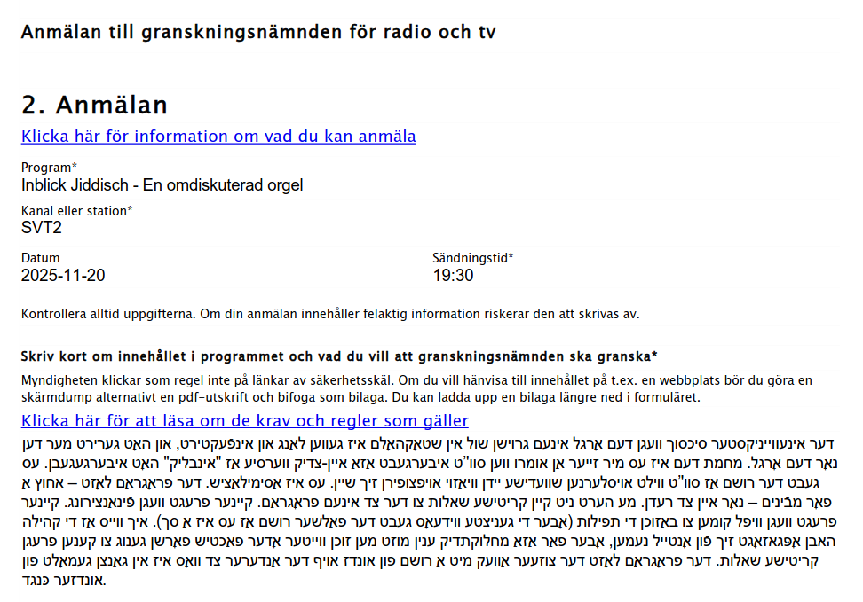 1. SVT sänder vansinnigt inslag på jiddisch. 2. Granskningsnämnden har vad jag kan hitta inga skriftliga regler om språk på anmälan.