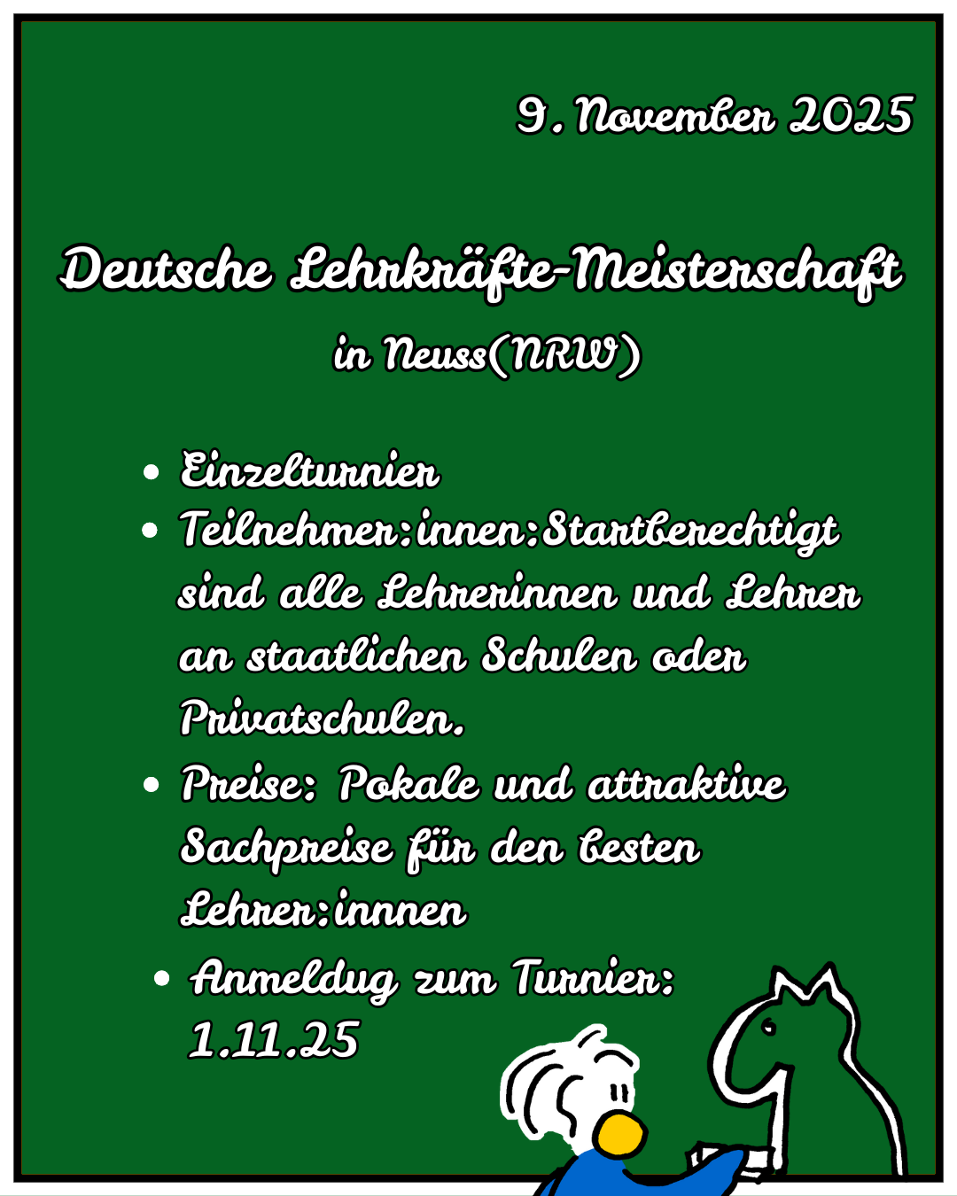 Die Deutsche Schulschachstiftung in Zusammenarbeit mit der DSJ richtet erneut die Deutsche Lehrermeisterschaft aus. Wir laden alle Lehrerinnen und Lehrer herzlich ein. Die anmeldung ist nur noch bis zum 1.11.2025 möglich. Jetzt anmelden unter: https://www.deutsche-schachjugend.de/termine…