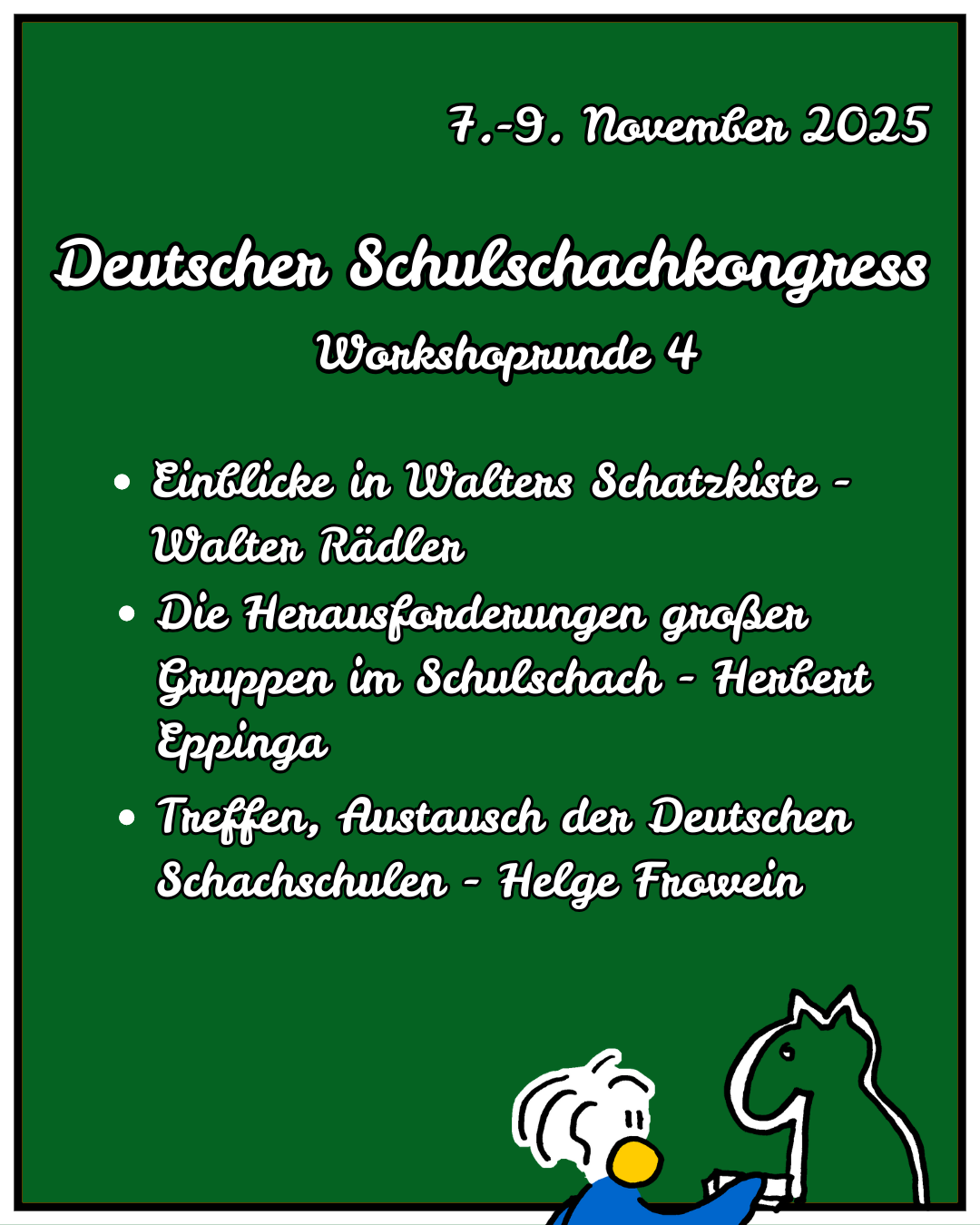 Nicht mehr lange bis zum #Schulschachkongress. Hier siehst du schon mal, welche Workshops dich am Samstag erwarten. Melde dich hier an: https://www.deutsche-schachjugend.de/termi