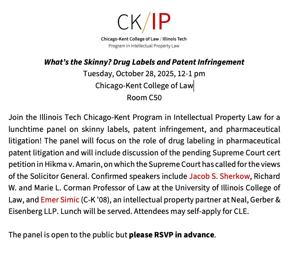 The Chicago-Kent, Illinois Tech IP Program cordially invites you to: "What’s the Skinny? Drug Labels and Patent Infringement," Tuesday, October 28, 2025 at 12-1 pm.
