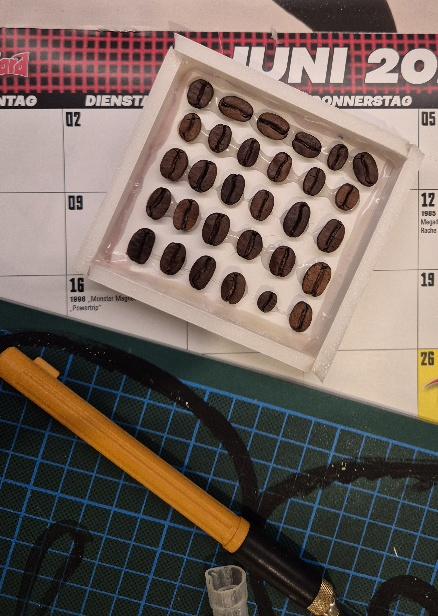 Was man eben so macht am ersten Januar. Ich habe Kaffeebohnen mit Silikon abgeformt. Wenn ich Kaffeeseife mache, dekoriere ich die gerne mit Kaffeebohnen aus Seife. Letztes Mal habe ich sie aus Knetseife von Hand geformt. Das fand ich aber recht mühselig. Heute Abend kann ich mal schauen, ob das mit der Gussform etwas geworden ist.