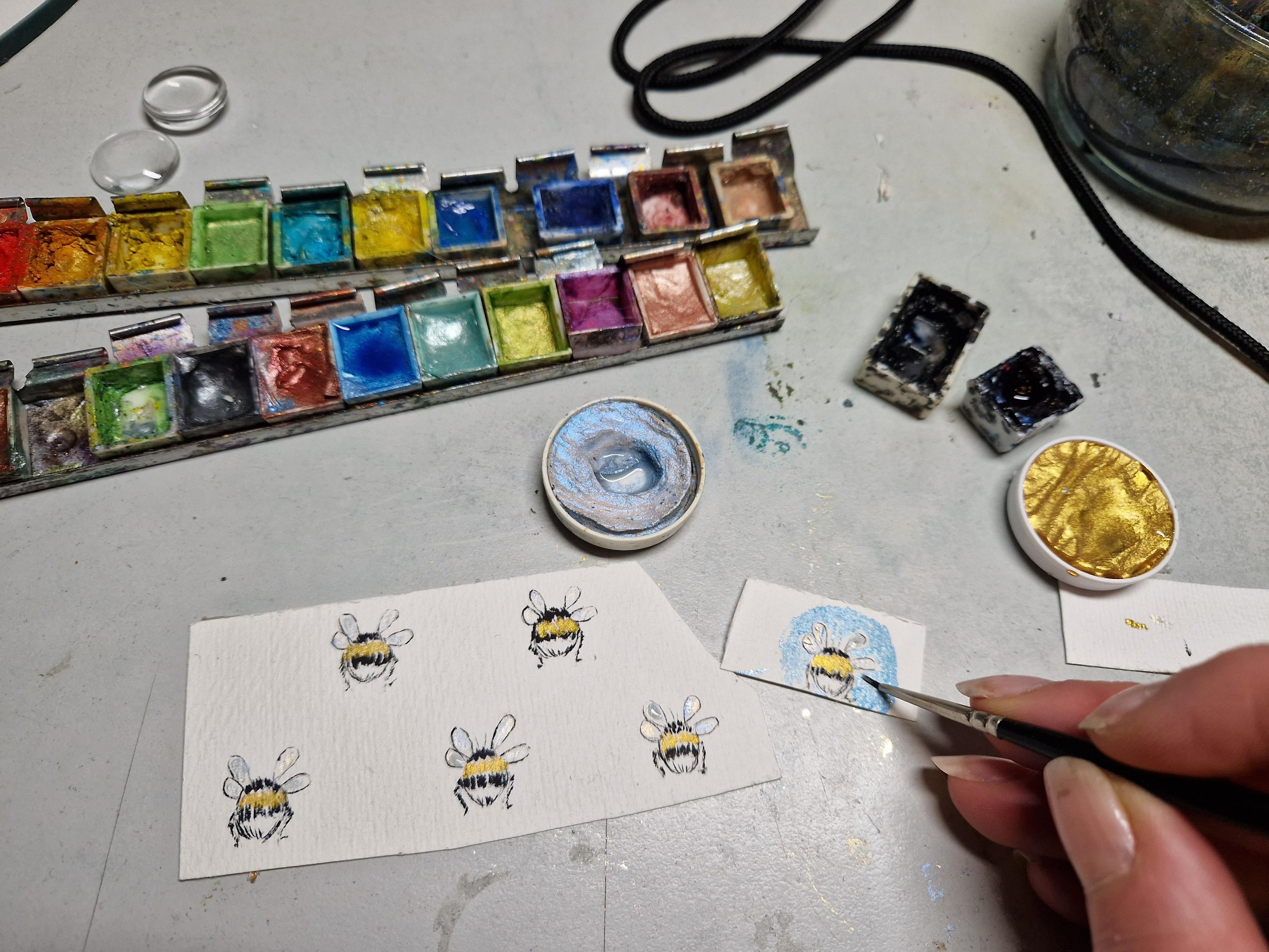 Für das sonst übliche Tageslichtvideo fertiger Bilder bin ich heute schon zu spät dran, aber sie glänzen auch im Schein der Arbeitsleuchte. Die handgemalten #wandklex Originale sind seit eben im Shop auf #watercolor #watercolour #aquarell #art #artShop #fediart #mastoart #creativeToots #artforsale