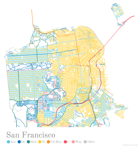Maps of cities coloured by street/road/ave/etc.