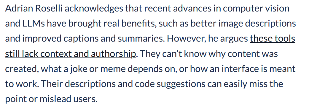 I did *not* say LLMs provide better image descriptions. I cited SeeingAI and Be My Eyes as tools for undescribed IRL uses.