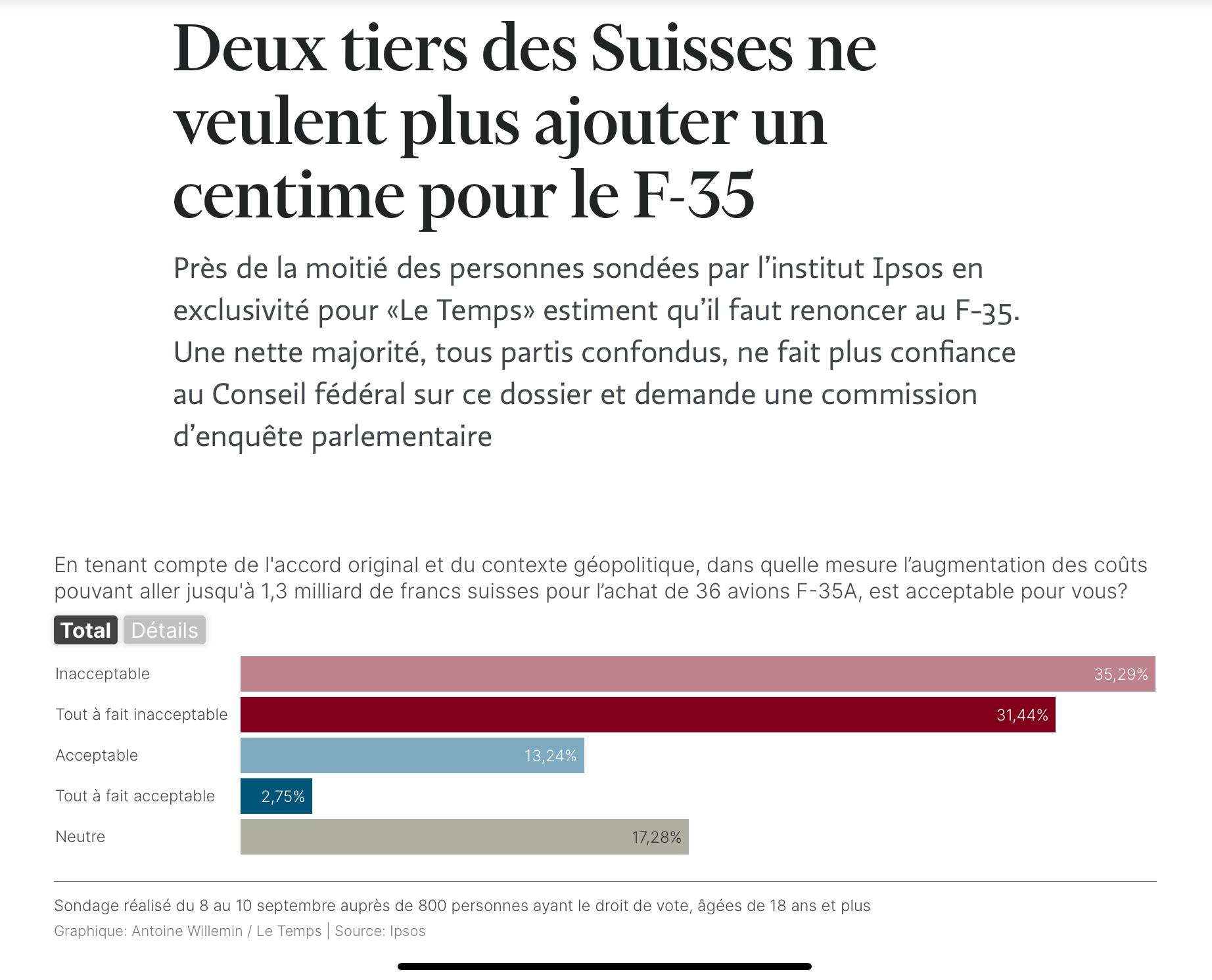 VoilŠ pourquoi le Conseil des Etats a peur d'un vote sur les surcoûts du F-35. Cela ne passerait pas au peuple. Au lieu d'affronter au défi, la majorité de droite continue Š miser sur le Prinzip Hoffnung, Š l'instar de Amherd, qui ignorait tous les signaux d'alarme - avant que le scandale explosera en plein vol. C'est l'histoire annoncée d'une faillite des institutions.