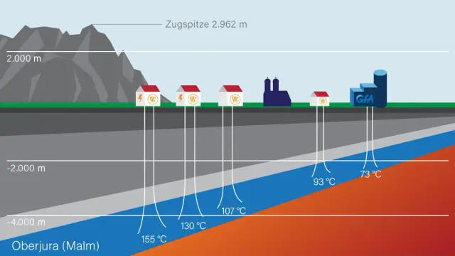 Das kommunale Unternehmen GfA erwartet in mehreren Kilometern Tiefe rund 73 Grad heißes Wasser, das …