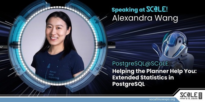Alexandra Wang will speak on 'Helping the Planner Help You: Extended Statistics in PostgreSQL' as part of our PostgreSQL@SCaLE track at SCaLE 23x. Full details: https://www.socallinuxexpo.org/scale/23x