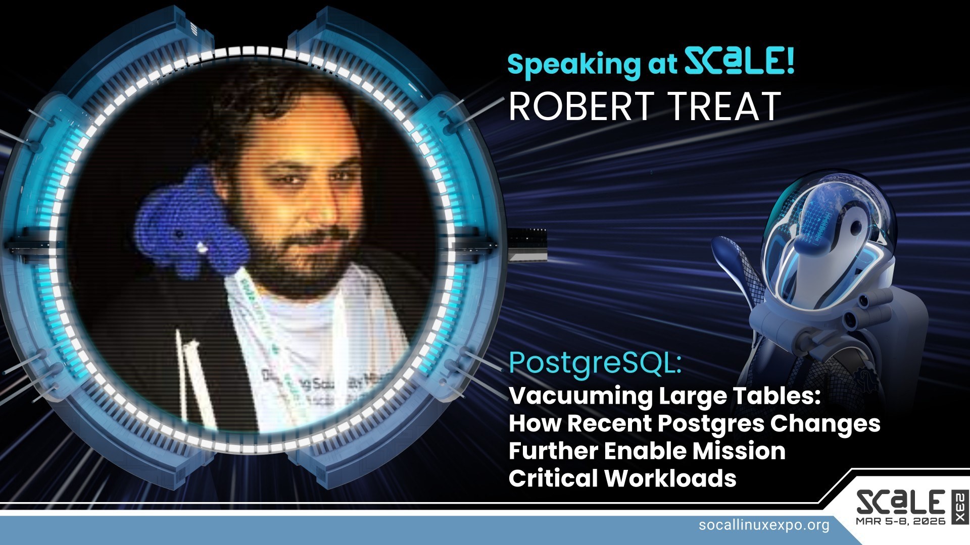 Robert Treat will speak on 'Vacuuming Large Tables: How Recent Postgres Changes Further Enable Mission Critical Workloads' as part of our PostgreSQL@SCaLE track at SCaLE 23x. Full details: https://www.socallinuxexpo.org/scale/23x