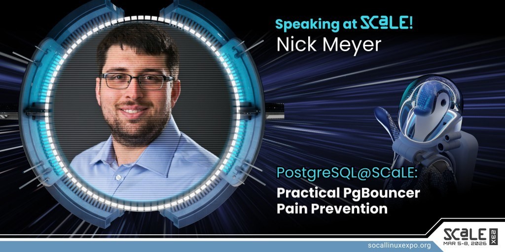 Nick Meyer will speak on 'Practical PgBouncer Pain Prevention' as part of our PostgreSQL@SCaLE track at SCaLE 23x. Full details: https://www.socallinuxexpo.org/scale/23x