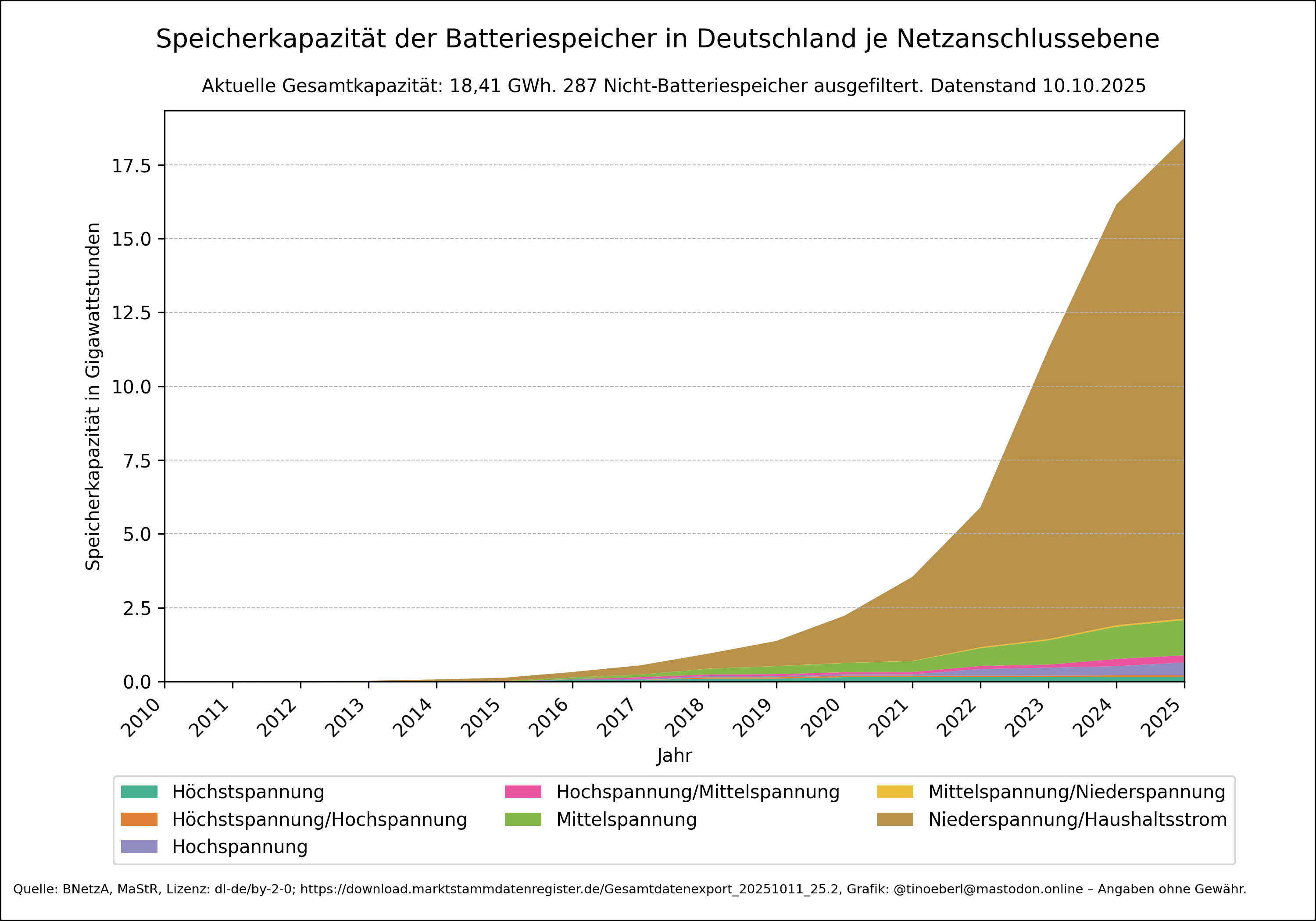 #Speicherkapazität der #Batteriespeicher in #Deutschland je Netzanschlussebene von 2010 bis 2025 mit Stand vom 10.10.2025.