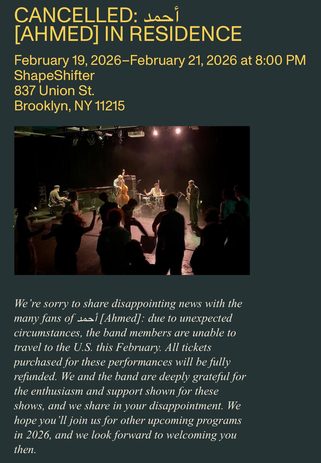 drag, the upcoming أحمد [AHMED] shows in #nyc got cancelled (with no mention of rescheduling). fouroneoneprojects.org/events/