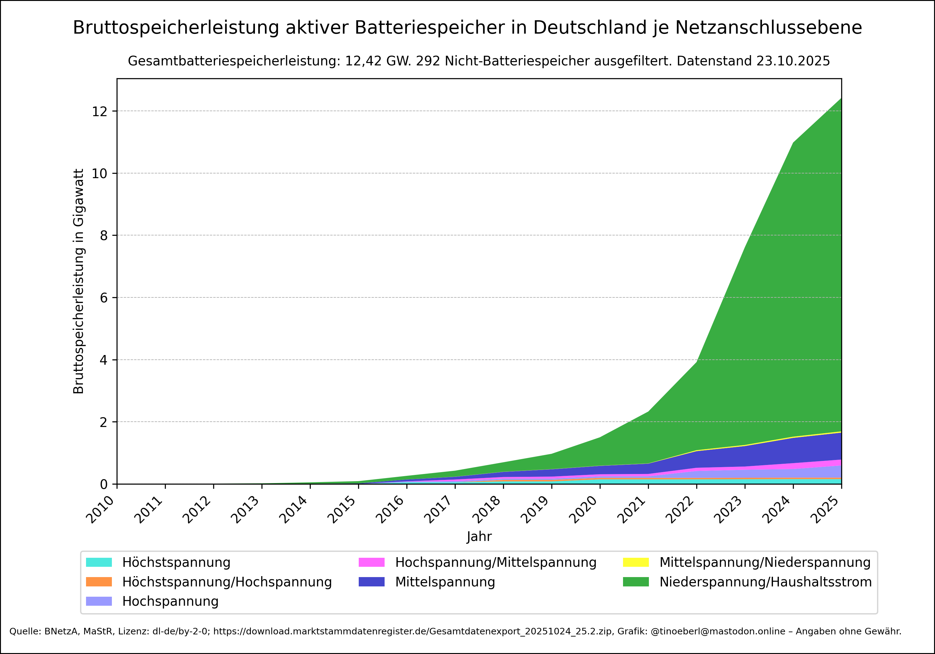 Bruttospeicherleistung aktiver #Batteriespeicher je #Netzanschlussebene in #Deutschland von 2010 bis 2025 mit Stand vom 23.10.2025.