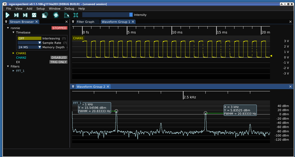 @… 's ngscopeclient showing a trace and fft (from a 1kHz sample) from my Rigol DS series scope; I can't say it's that happy with the Rigol, but hey I think that's as much about the Rigol's firmware.