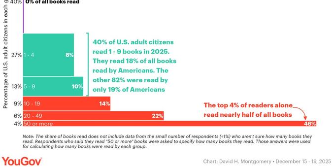 Survey of 2,203 US adults: 59% say they read at least one book in 2025; readers who prefer e-books report more reading than those who prefer print or audiobooks (David H. Montgomery/YouGov's The Surveyor)