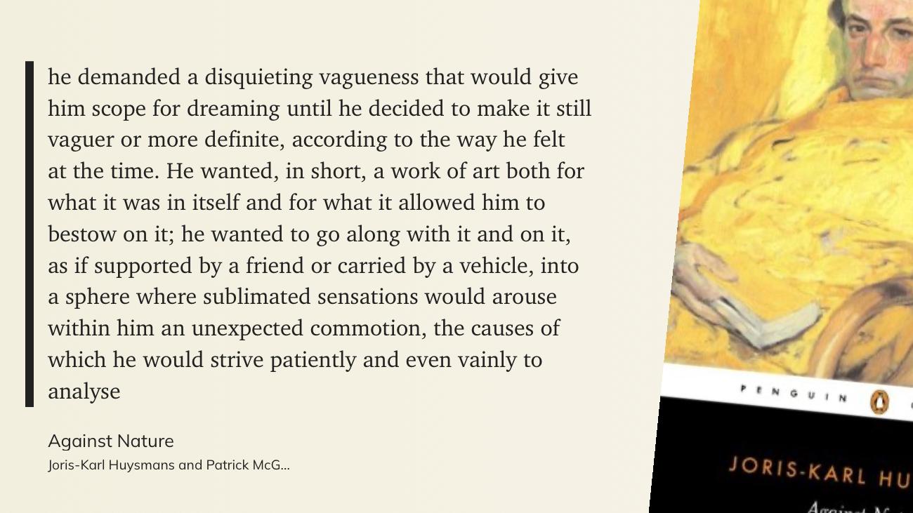 Love this in Huysmans about the ideal reading experience