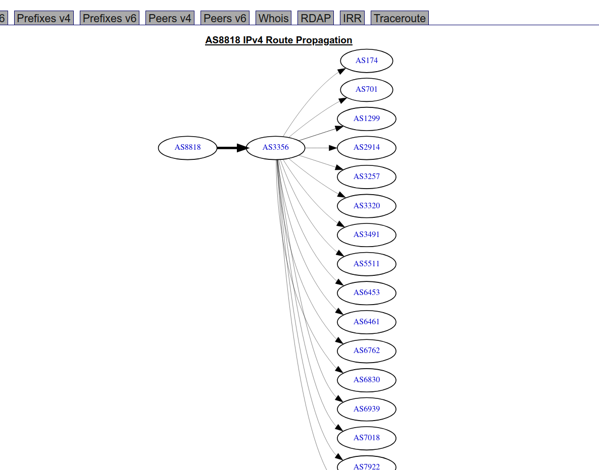 Looking at the routing side, AS8818 announces just two /19s and one /22 (and two /32s in IPv6) with a single upstream provider, Level 3 Inc. This suggests that Layer 3 redundancy is even more constrained.